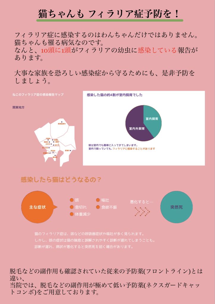 また、ネコちゃんのフィラリア予防もおすすめしております。